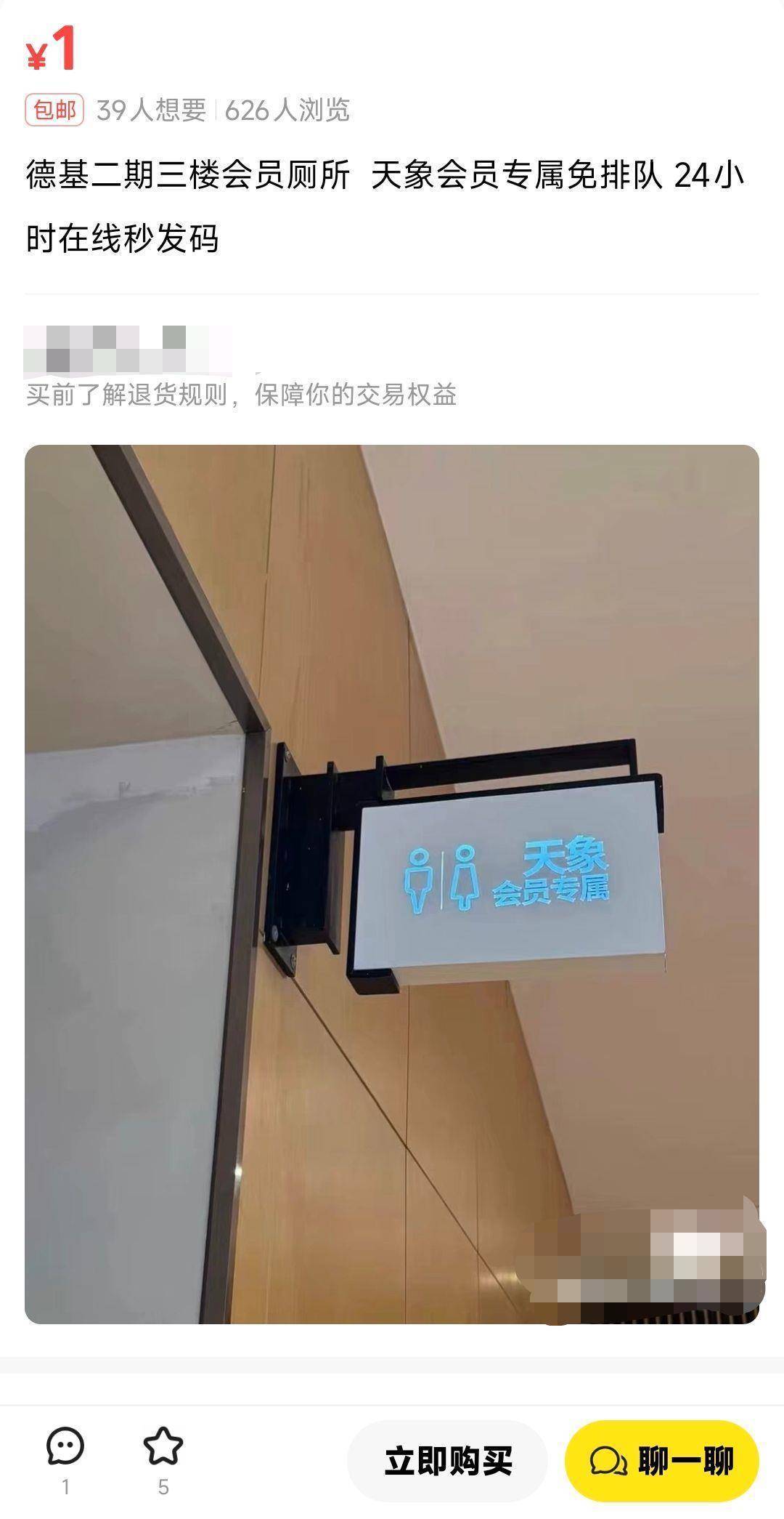 极目新闻记者注意到,在二手交易平台上,有商家出售德基广场会员专属厕所的会员码,售价1元钱,有网友询问会员码应该怎样使用。